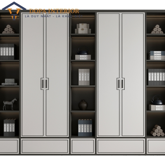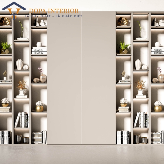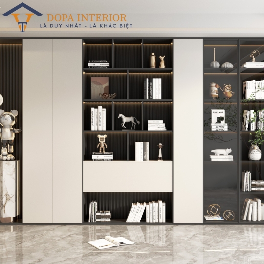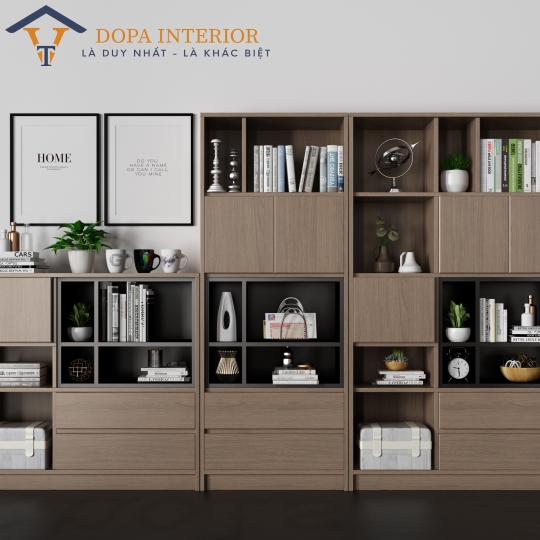 Công năng: vừa để trưng bày những món đồ lưu niệm, sách, tượng, bình hoa, rượu… vừa có ngăn kín để chứa đồ ít dùng, giúp không gian gọn gàng.